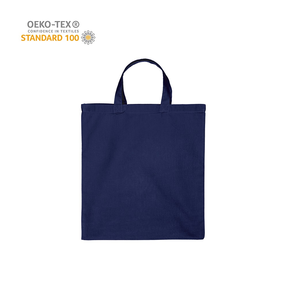 Katoenen draagtas gemaakt van 140 grams donkerblauw katoen, Oeko-tex 100 gecertificeerd. De draagtas is voorzien van 2 korte handgrepen die zijn aangestikt aan de binnenzijde van de draagtas.