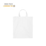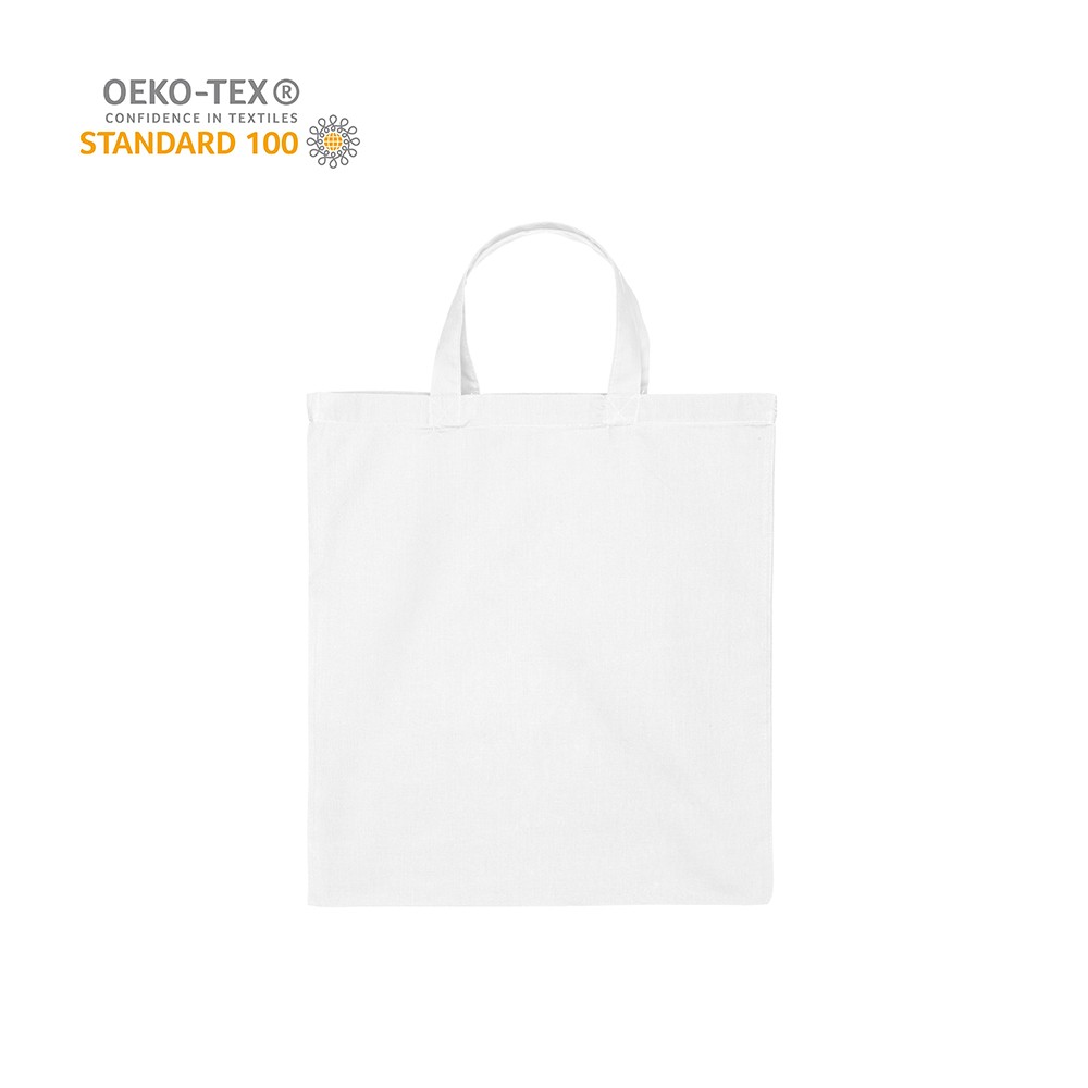 Katoenen draagtas gemaakt van 140 grams wit katoen, Oeko-tex 100 gecertificeerd. De draagtas is voorzien van 2 korte handgrepen die zijn aangestikt aan de binnenzijde van de draagtas.