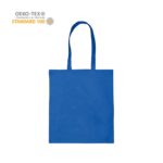 Katoenen draagtas gemaakt van 140 grams blauw katoen, Oeko-tex 100 gecertificeerd. De draagtas is voorzien van 2 schouderhengsels die zijn aangestikt aan de binnenzijde van de draagtas.