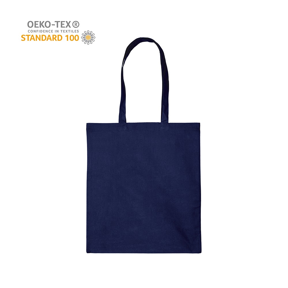 Katoenen draagtas gemaakt van 140 grams donkerblauw katoen, Oeko-tex 100 gecertificeerd. De draagtas is voorzien van 2 schouderhengsels die zijn aangestikt aan de binnenzijde van de draagtas.