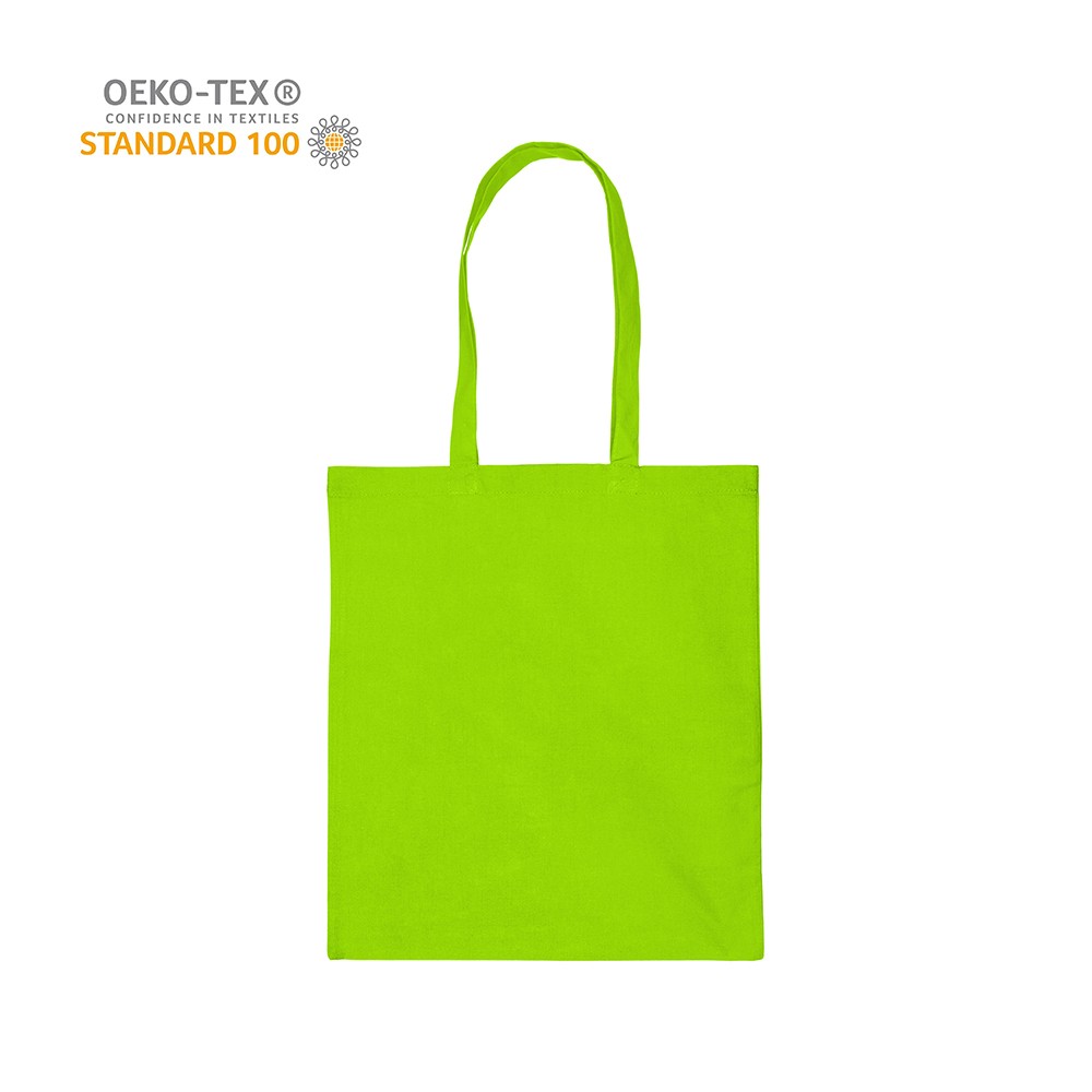 Katoenen draagtas gemaakt van 140 grams lichtgroen katoen, Oeko-tex 100 gecertificeerd. De draagtas is voorzien van 2 schouderhengsels die zijn aangestikt aan de binnenzijde van de draagtas.