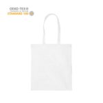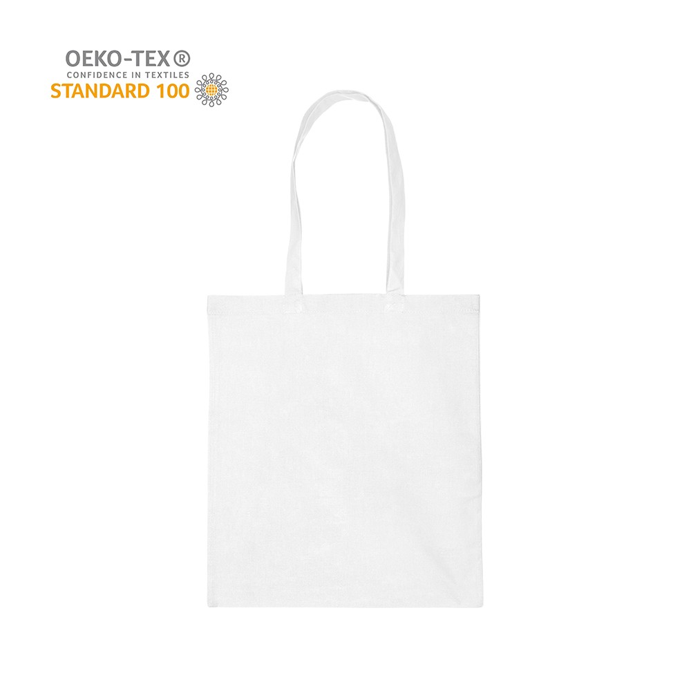 Katoenen draagtas gemaakt van 140 grams wit katoen, Oeko-tex 100 gecertificeerd. De draagtas is voorzien van 2 schouderhengsels die zijn aangestikt aan de binnenzijde van de draagtas.
