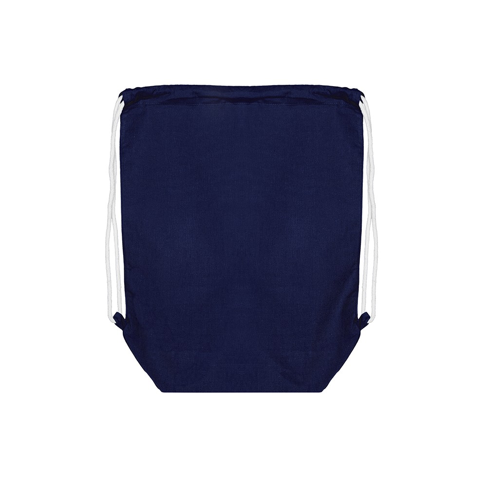 Katoenen rugtas gemaakt van 140 grams donkerblauw katoen. De rugtas is voorzien van 2 trekkoorden voor het sluiten van de rugtas.