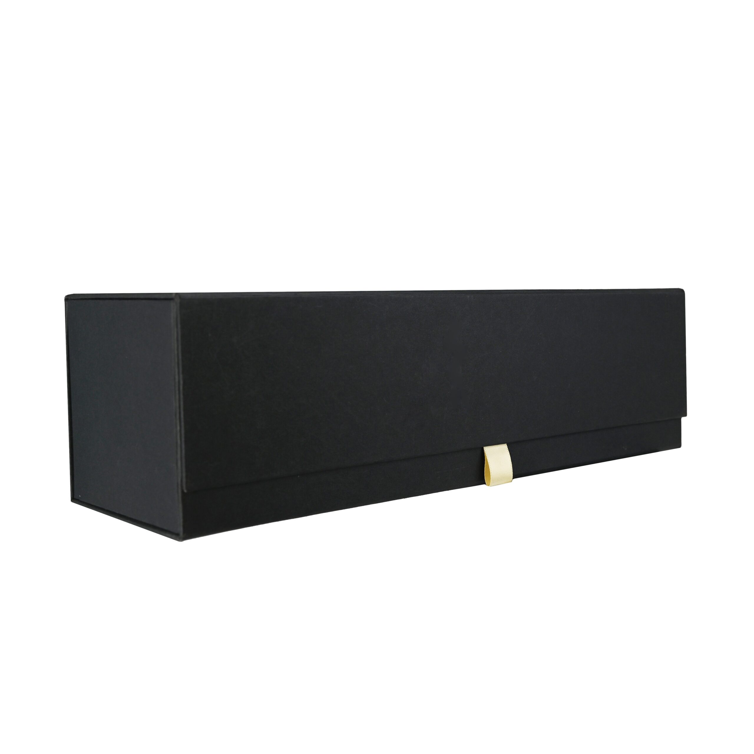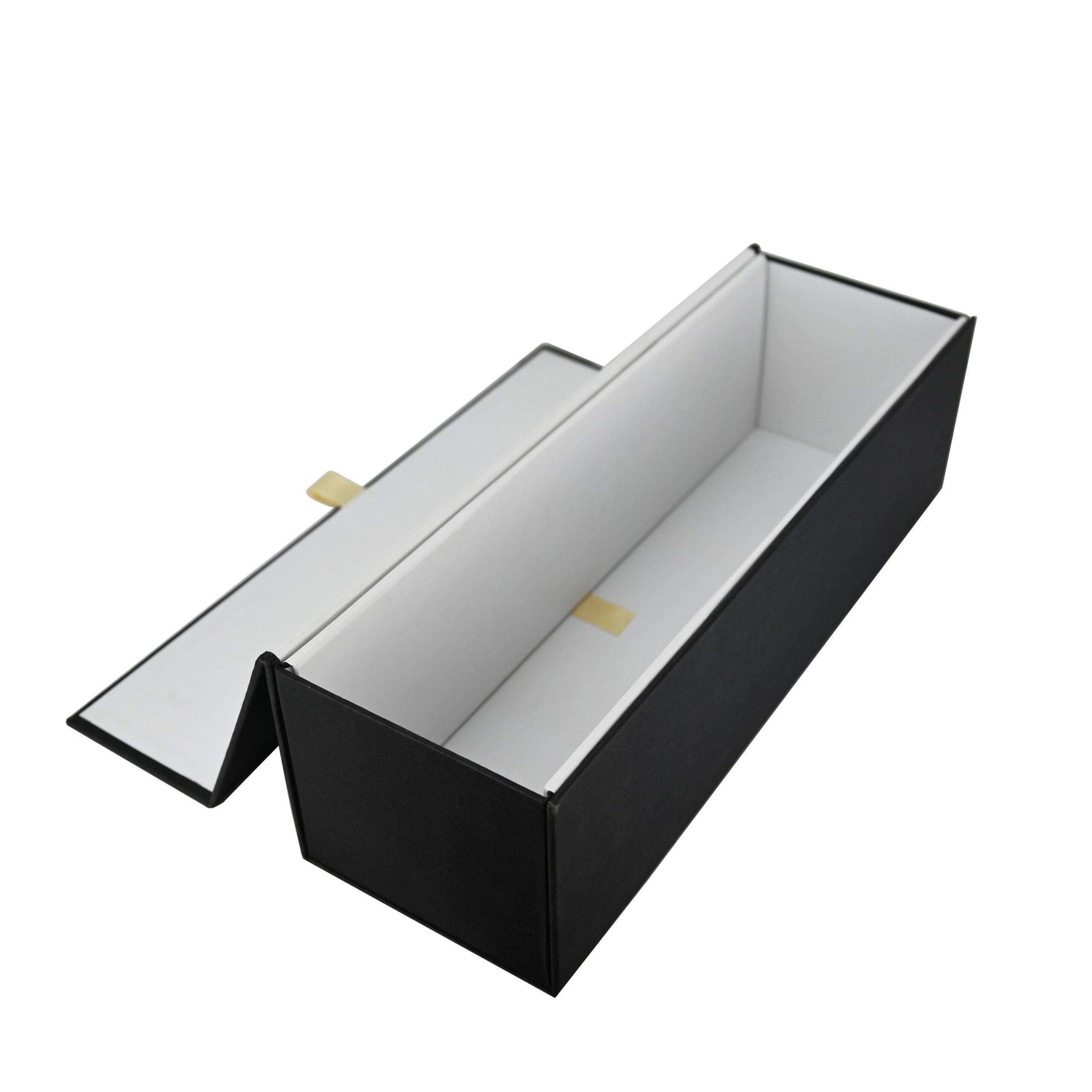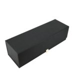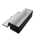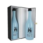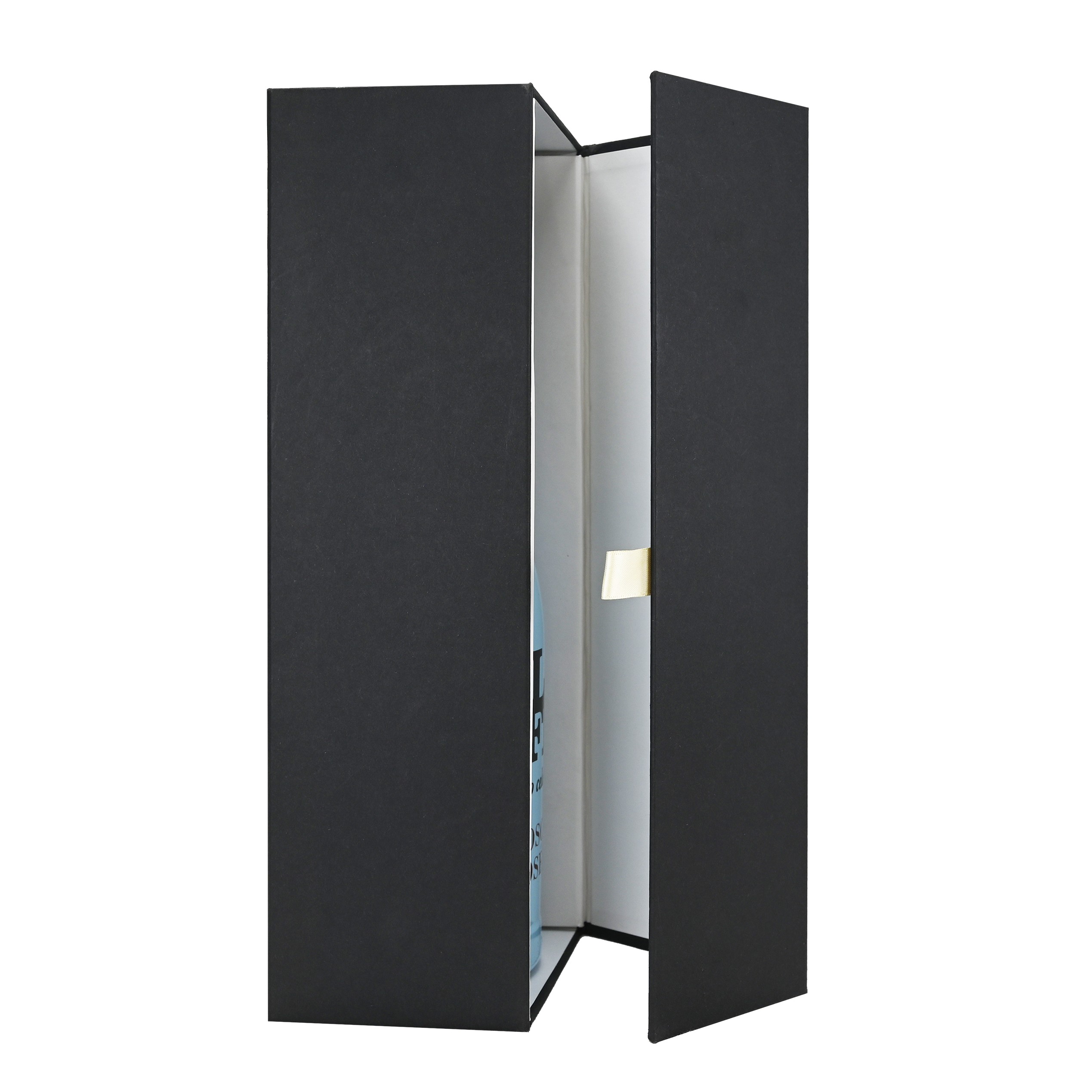 Luxe fles magneetdoos gemaakt van stevig 1500 g/m² mat gelamineerd zwart karton aan de buitenkant en mat wit aan de binnenkant. De luxe fles magneetdoos is zeer gemakkelijk te monteren dankzij de magnetische afsluitdeksel met een kleine lint en de binnenflappen die vast worden zetten met klittenband. De luxe fles magneetdoos wordt plano en dus ruimtebesparend geleverd.