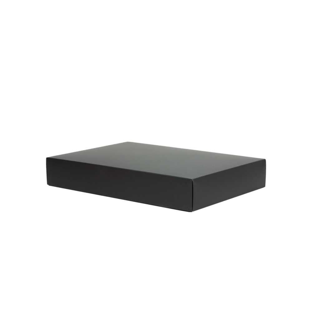 Luxe tweedelige geschenkdoos gemaakt van 500 g/m² zwart mat gelamineerd karton. De luxe geschenkdoos wordt plano (ruimtebesparend) in 2 delen geleverd en is eenvoudig te assembleren.