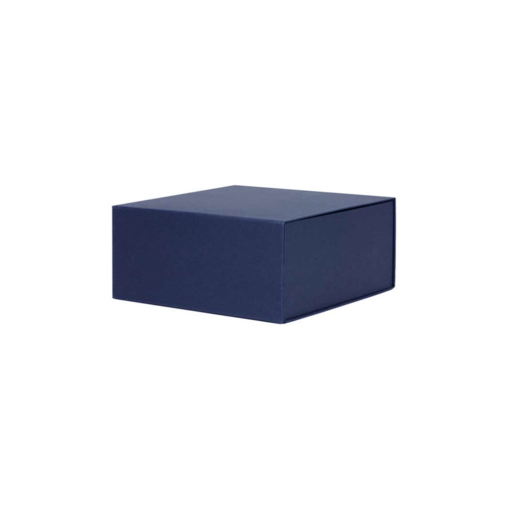 Luxe magneetdoos met automatische montage en magnetische klepsluiting, gemaakt van stevig karton van 1200 g/m², aan de binnen- en buitenkant bedekt met 120 g/m² blauw geverfd kraftpapier, voor een totaal van 1440 g/m². De luxe magneetdoos is voorzien van zelfklevende strips die zorgen voor een permanente montage. De luxe magneetdoos wordt plano en dus ruimtebesparend geleverd.