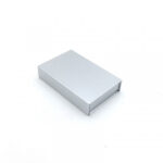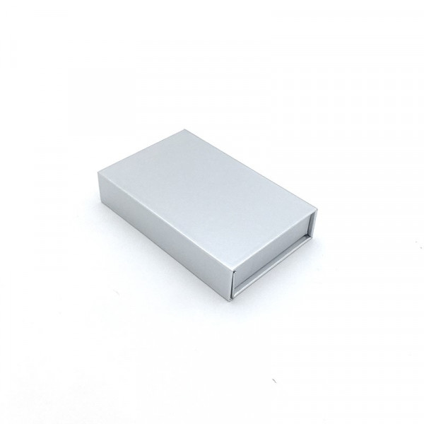 De luxe magneetdoos, 12x2x7 cm – zilver glans – voor kadobon, klantenkaart of creditcard, met inlay, heeft een sluitende magnetische klep en is gemaakt van hard karton van 1200g/m² en bevat een kartonnen steunstuk.