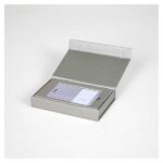De luxe magneetdoos, 12x2x7 cm – zilver mat – voor kadobon, klantenkaart of creditcard, met inlay, heeft een sluitende magnetische klep en is gemaakt van hard karton van 1200g/m² en bevat een kartonnen steunstuk.