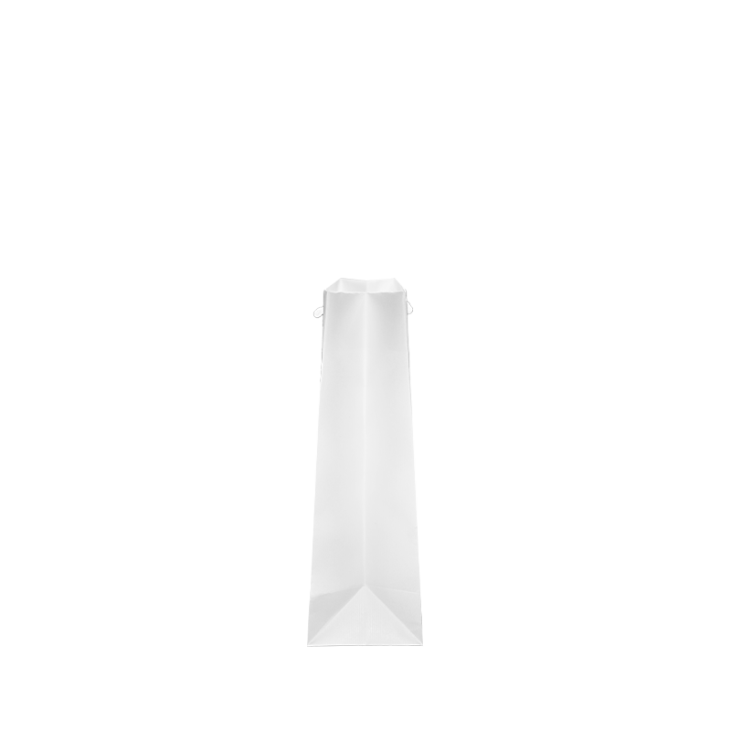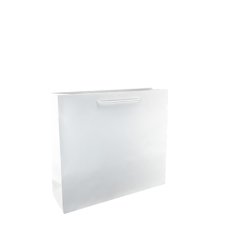 Luxe papieren draagtas met omgeslagen bovenrand, gemaakt van 120 grams wit gestreept papier. De draagtas is voorzien van 2 witte katoenen koorden die zijn vastgeknoopt aan de binnenzijde van de draagtas.