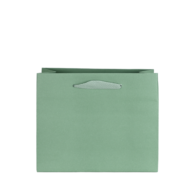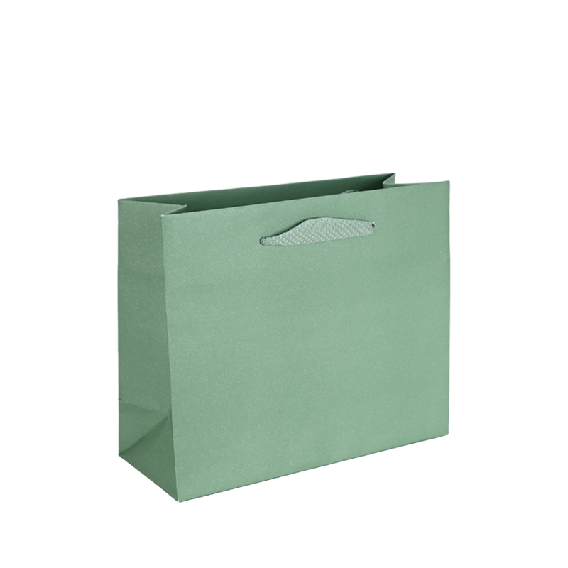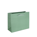 Groene bedrukte luxe papieren draagtas met omgeslagen bovenrand, gemaakt van 170 grams wit kraft papier. De draagtas is voorzien van 2 groen kleurige katoenen linten die zijn vastgeknoopt aan de binnenzijde van de draagtas. De binnenzijde van de tas is wit.