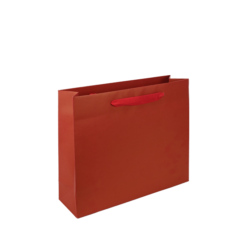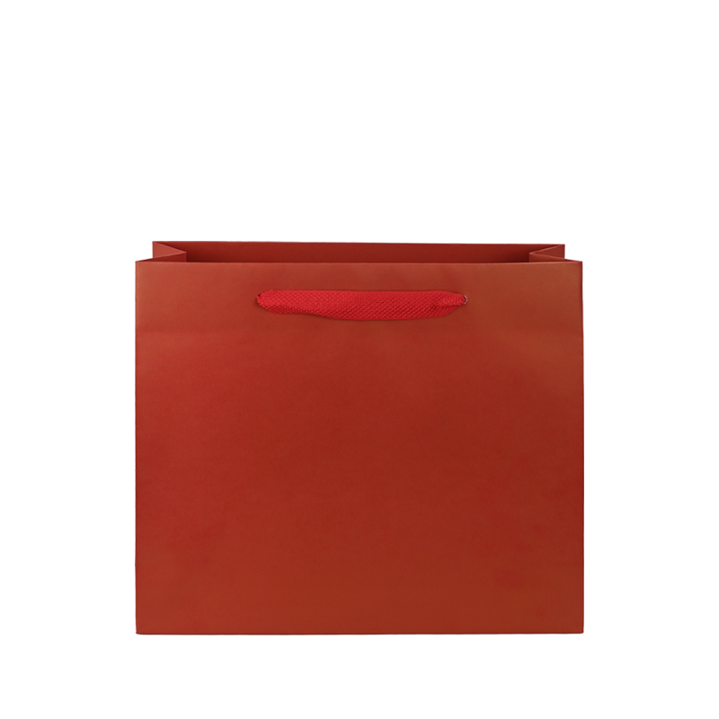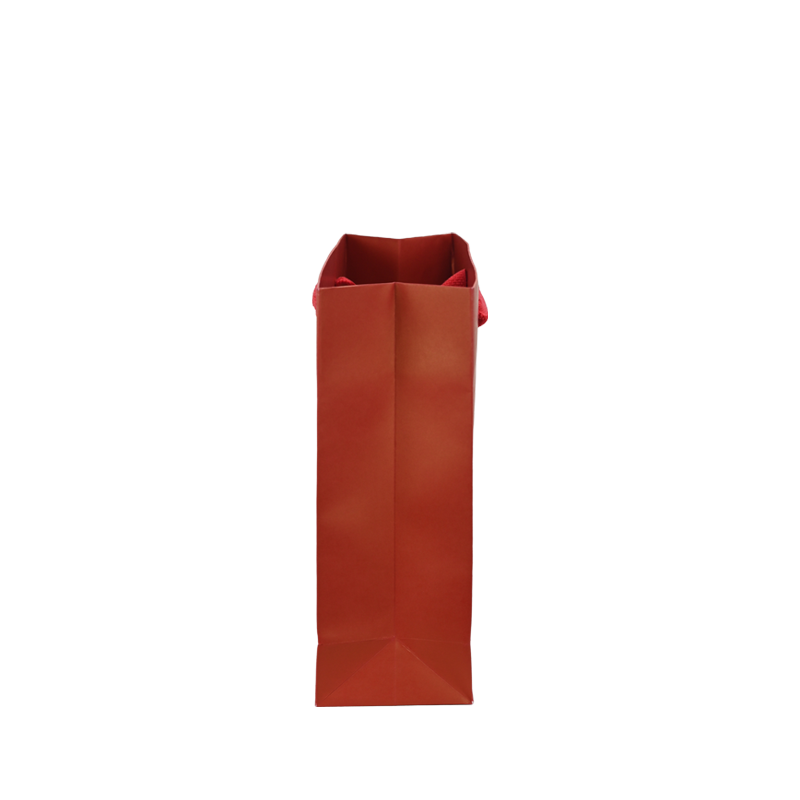 Rood bedrukte luxe papieren draagtas met omgeslagen bovenrand, gemaakt van 170 grams wit kraft papier. De draagtas is voorzien van 2 rode katoenen linten die zijn vastgeknoopt aan de binnenzijde van de draagtas. De binnenzijde van de tas is wit.