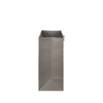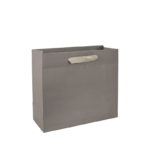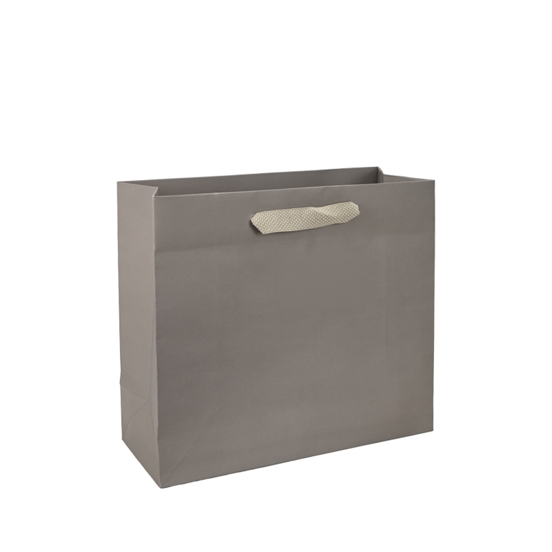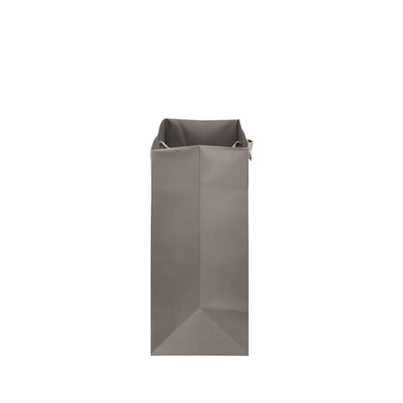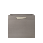 Taupekleurig bedrukte luxe papieren draagtas met omgeslagen bovenrand, gemaakt van 170 grams wit kraft papier. De draagtas is voorzien van 2 crème kleurig katoenen linten die zijn vastgeknoopt aan de binnenzijde van de draagtas. De binnenzijde van de tas is wit.
