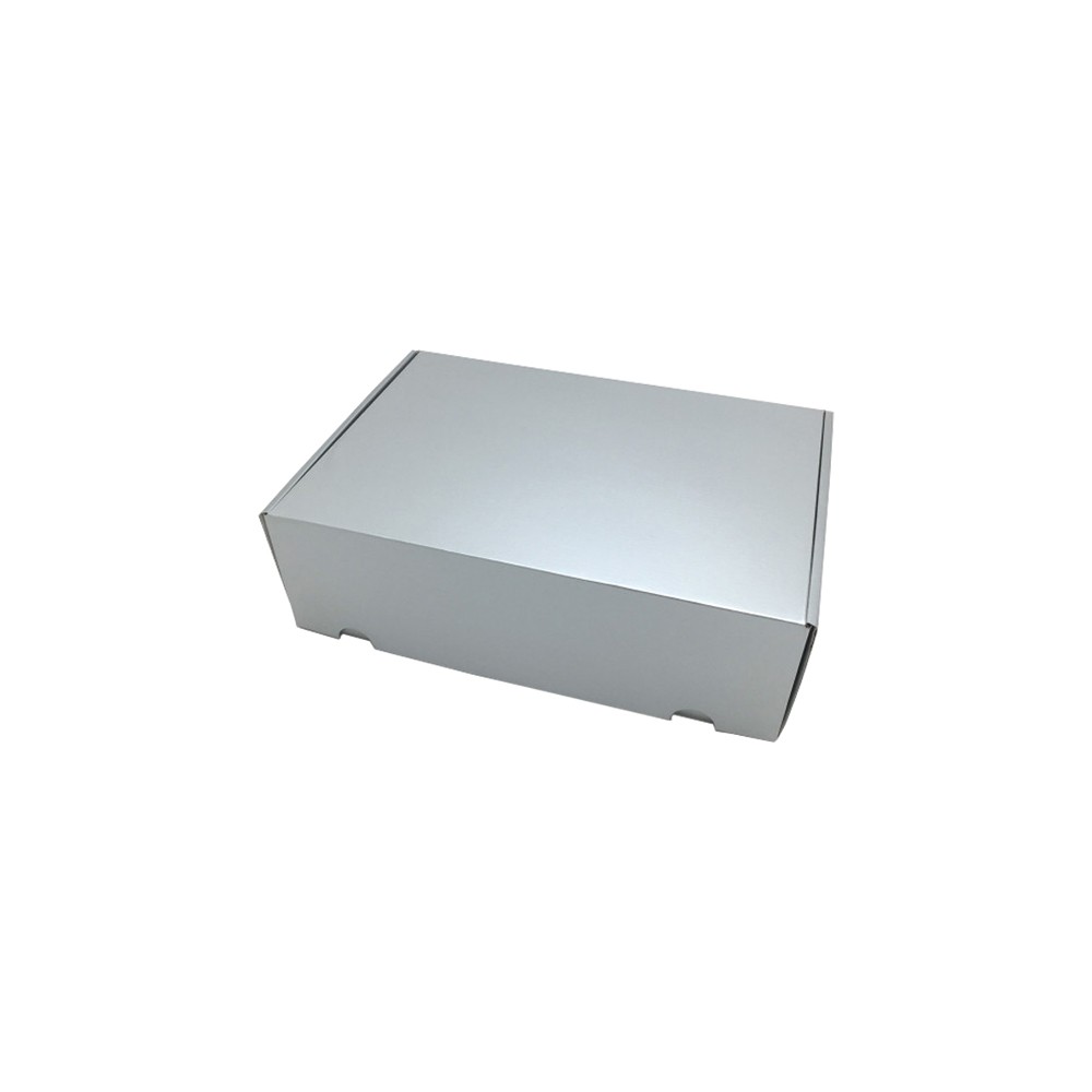 Luxe verzenddoos gemaakt van 2 mm golf karton 700 gr/m2 zilver kleurig bedrukt en voorzien van een krasbestendig glans laminaat. De luxe verzenddoos wordt eendelig plat geleverd en is zeer gemakkelijk in elkaar te zetten.