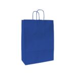 Blauw bedrukte papieren draagtas gemaakt van 100 grams wit kraft. De draagtas is voorzien van 2 blauwe gedraaide papieren handgrepen die zijn ingeplakt aan de binnenzijde van de draagtas. De binnenzijde van de tas is wit.