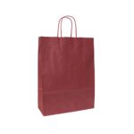 Bordeaux Rood bedrukte papieren draagtas gemaakt van 100 grams bruin gestreept papier. De draagtas is voorzien van 2 bordeaux rode gedraaide papieren handgrepen die zijn ingeplakt aan de binnenzijde van de draagtas. De binnenzijde van de tas is bruin.