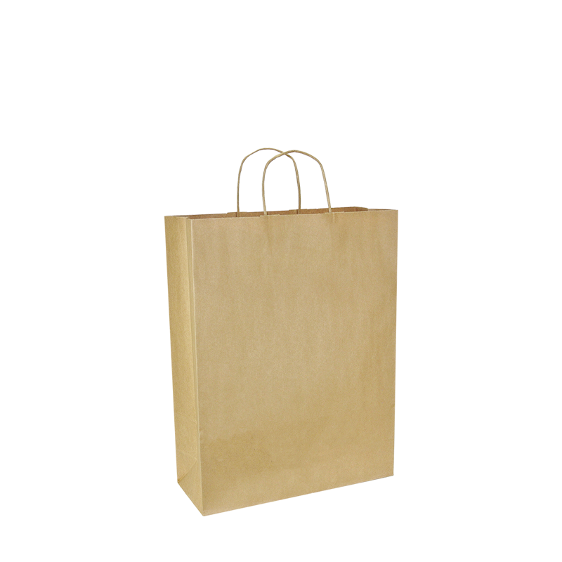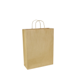 Papieren draagtas gemaakt van bruin gerecyled kraft papier. De draagtas is voorzien van 2 bruine gedraaide papieren handgrepen die zijn ingeplakt aan de binnenzijde van de draagtas.