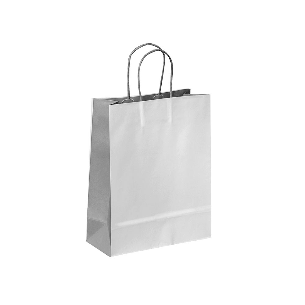 Licht grijs en grijs bedrukte papieren draagtas met omgeslagen bovenrand, gemaakt van 120 grams wit kraft. De draagtas is voorzien van 2 grijze gedraaide papieren handgrepen die zijn ingeplakt aan de binnenzijde van de draagtas.