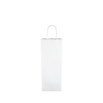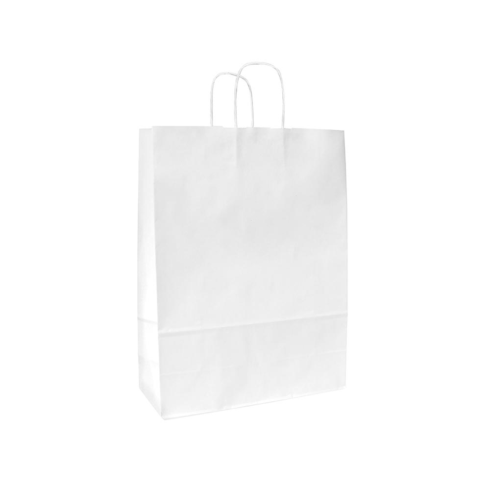 Papieren draagtas gemaakt van 100 grams wit kraft papier. De tas is voorzien van 2 witte gedraaide papieren handgrepen die zijn ingeplakt aan de binnenzijde van de draagtas.