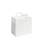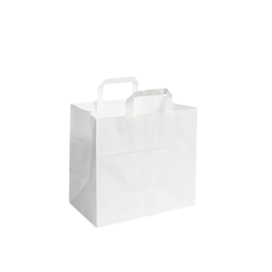Papieren ‘Take Away’ draagtas gemaakt van wit kraft papier. De draagtas is voorzien van 2 witte platte papieren handgrepen die zijn ingeplakt aan de binnenzijde van de draagtas.