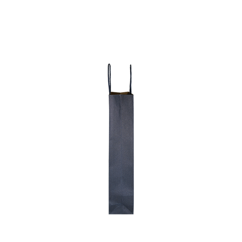 Blauw bedrukte papieren wijntas gemaakt van 120 grams bruin gestreept papier. De wijntas is voorzien van 2 blauwe gedraaide papieren handgrepen die zijn ingeplakt aan de binnenzijde van de wijntas. De binnenzijde van de tas is bruin.
