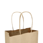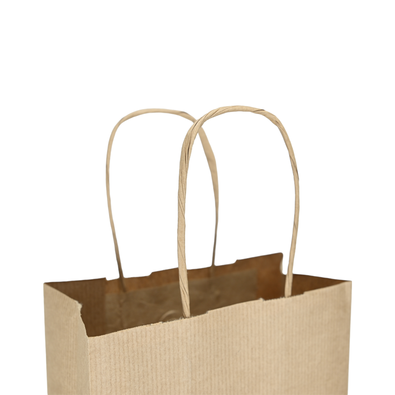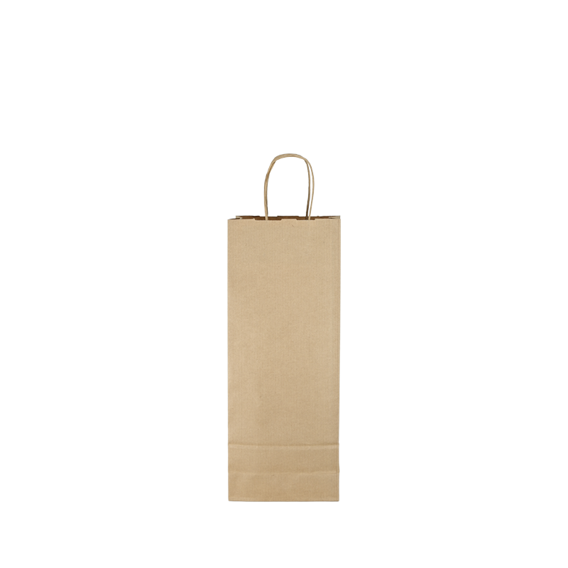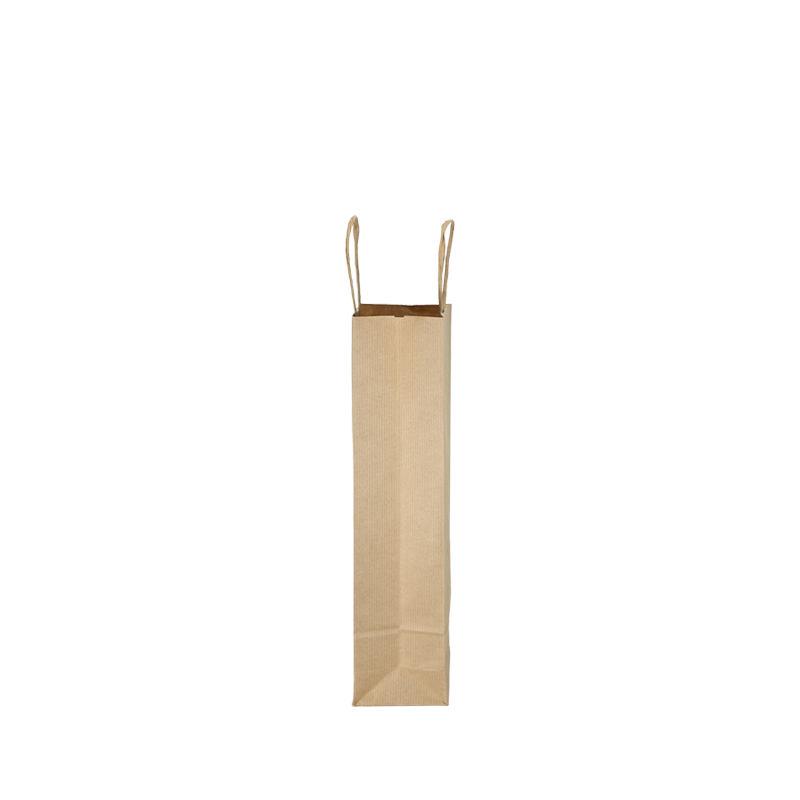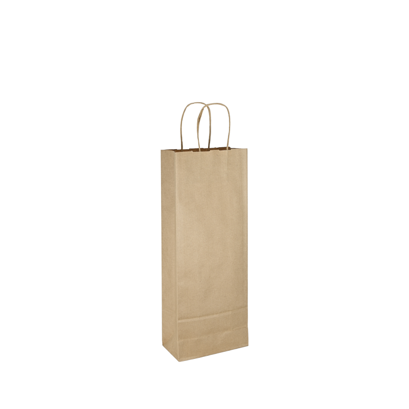 Papieren wijntas gemaakt van 120 grams bruin gestreept papier. De wijntas is voorzien van 2 bruine gedraaide papieren handgrepen die zijn ingeplakt aan de binnenzijde van de wijntas.