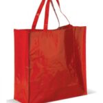 PP woven glans gelamineerde draagtas gemaakt van 160 grams rood woven polypropyleen. De draagtas is voorzien van twee korte rode handgrepen die zijn aangestikt aan de binnenzijde van de draagtas.